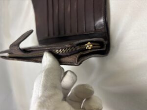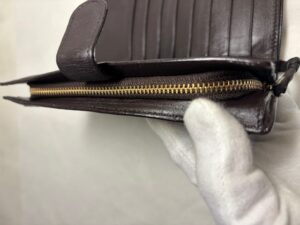 今回のご紹介は BOTTEGA VENETA  二つ折り財布の修理です。状態としましては、まずファスナーのファスナーテープ(布の部分)に破れがあり、開閉ができない状態でした。また、お財布本体も長年の使用による経年劣化で、色落ちやスレが多数あるものでした。ファスナーは新品へ、お財布本体は全体の色補修とコバの再生のご依頼をいただきました。